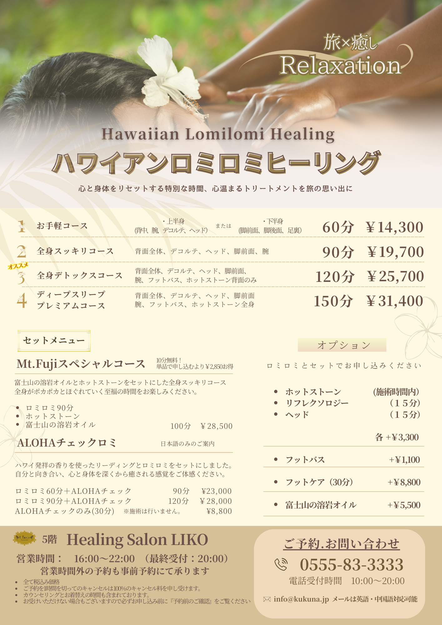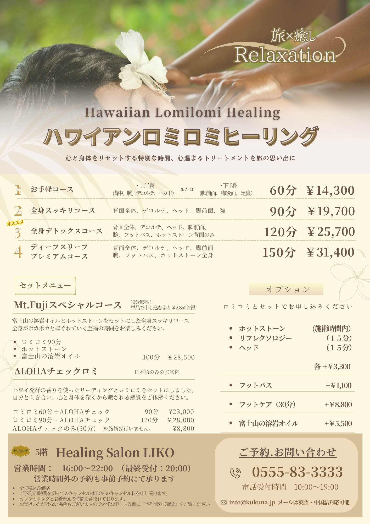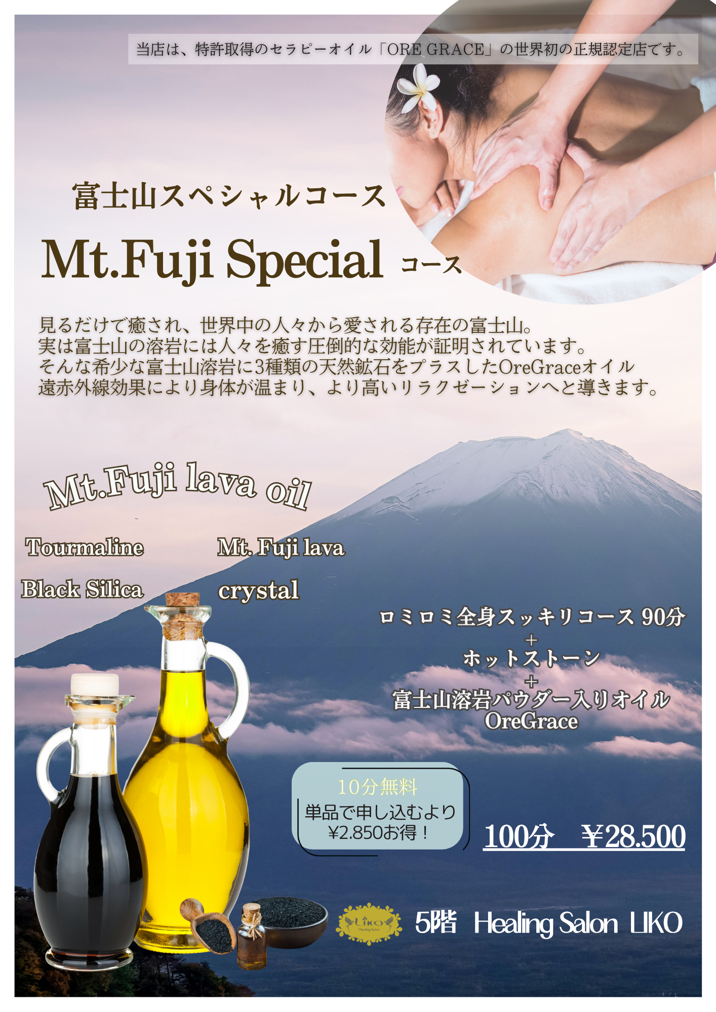富士山の溶岩、水晶、ブラックシリカ、トルマリンなど、母なる地球からの恵みを贅沢に使ったOreGraceオイル。ほかのオイルでは体感できない温かさが実証されています。 ホットストーンとロミロミ全身スッキリコースを組み合わせ、10分無料つきのお得なコースで 富士山の麓、KUKUNAならではのリラクゼーションをお楽しみください。