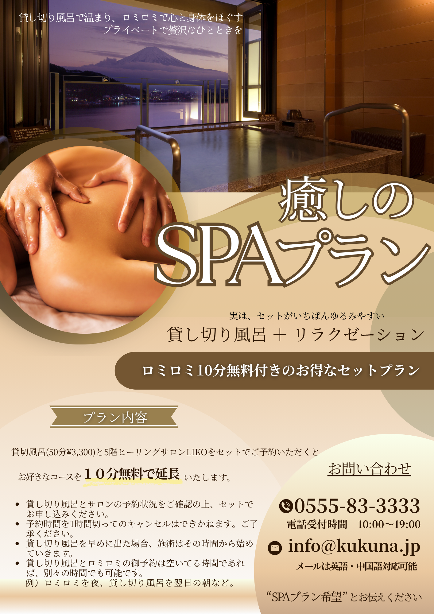 貸し切り風呂(50分¥3,300)とHealing Salon LIKOのお好きなコースをセットでお申込みいただくと、施術が10分無料延長サービスとなるお得なコースです。それぞれのご予約状況をお確かめの上、セットでお申し込みください。