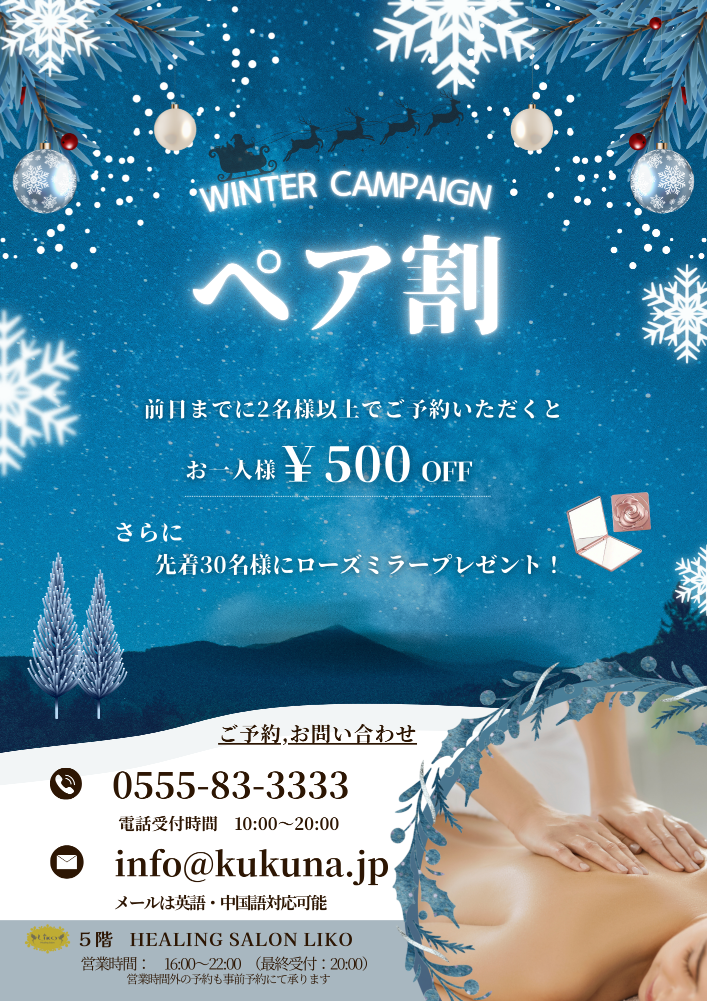 【 𝟏𝟐月限定|ペア割キャンペーン】12月は “誰かと一緒の癒し時間” をもっと特別に! 前日までに2名様以上でご予約いただくとお一人様 500円OFF! さらに… 先着30名様に “ローズミラー” をプレゼント‼ 旅の思い出にも、毎日の持ち歩きにも◎ カップルで、ご夫婦で、友達旅で。 ゆっくり整う時間をご一緒にお過ごしください